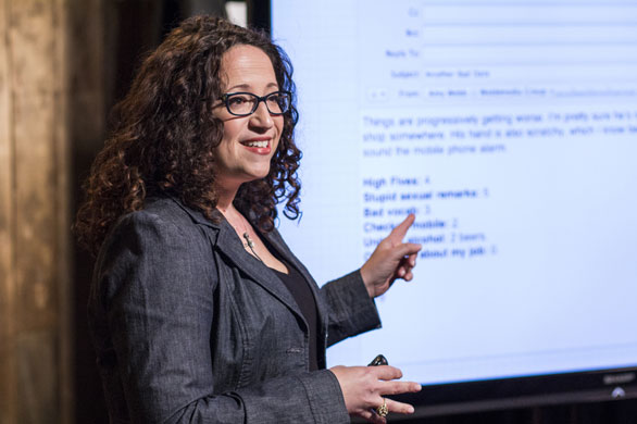 Amy cuddy speaks onstage at the new york times new work summit on march 1, 2016, in half moon bay, california.